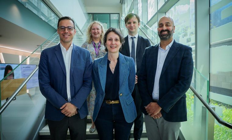 PHOTO: From Left: Dr. Aristotle Voineskos (CAMH), Sarah Downey (CAMH), Dr. Viviane Poupon (Brain Canada), Dr. Tristan Glatard (CAMH), and Dr. Ali Khan (Western) in Toronto. (CNW Group/Brain Canada)