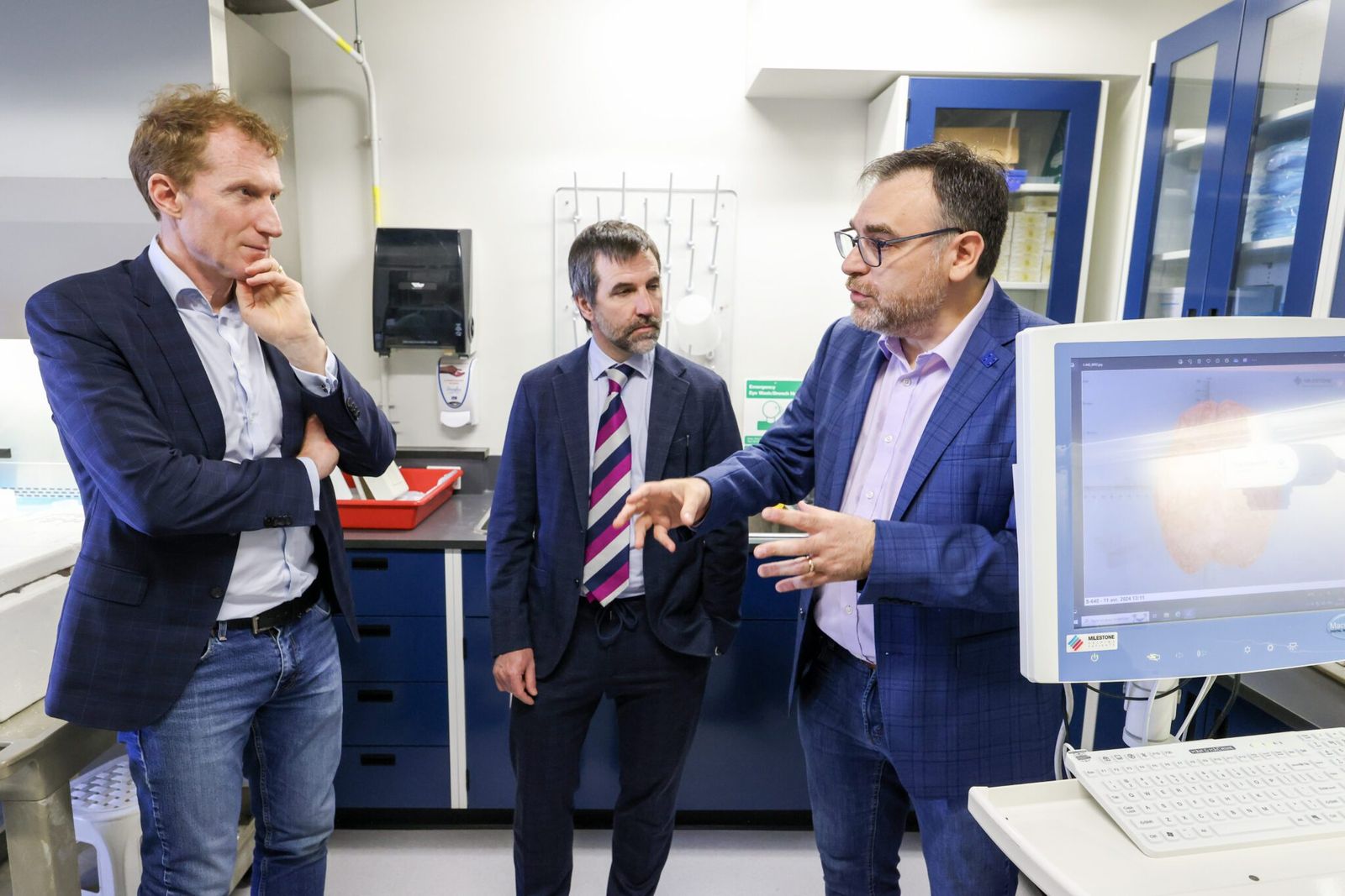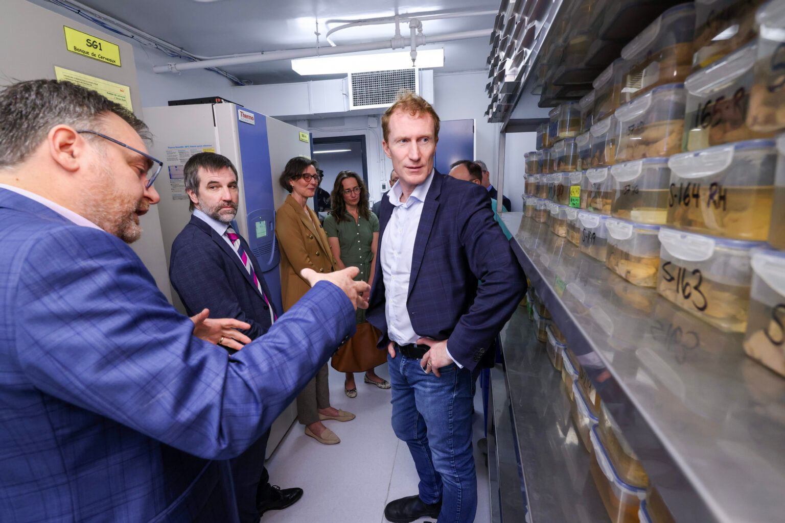 Dr. Naguib Mechawar, co-director of the Douglas-Bell Canada Brain Bank gives elected officials, including Ministers Miller and Guilbeault, a tour of the Brain Bank on Friday, May 31.