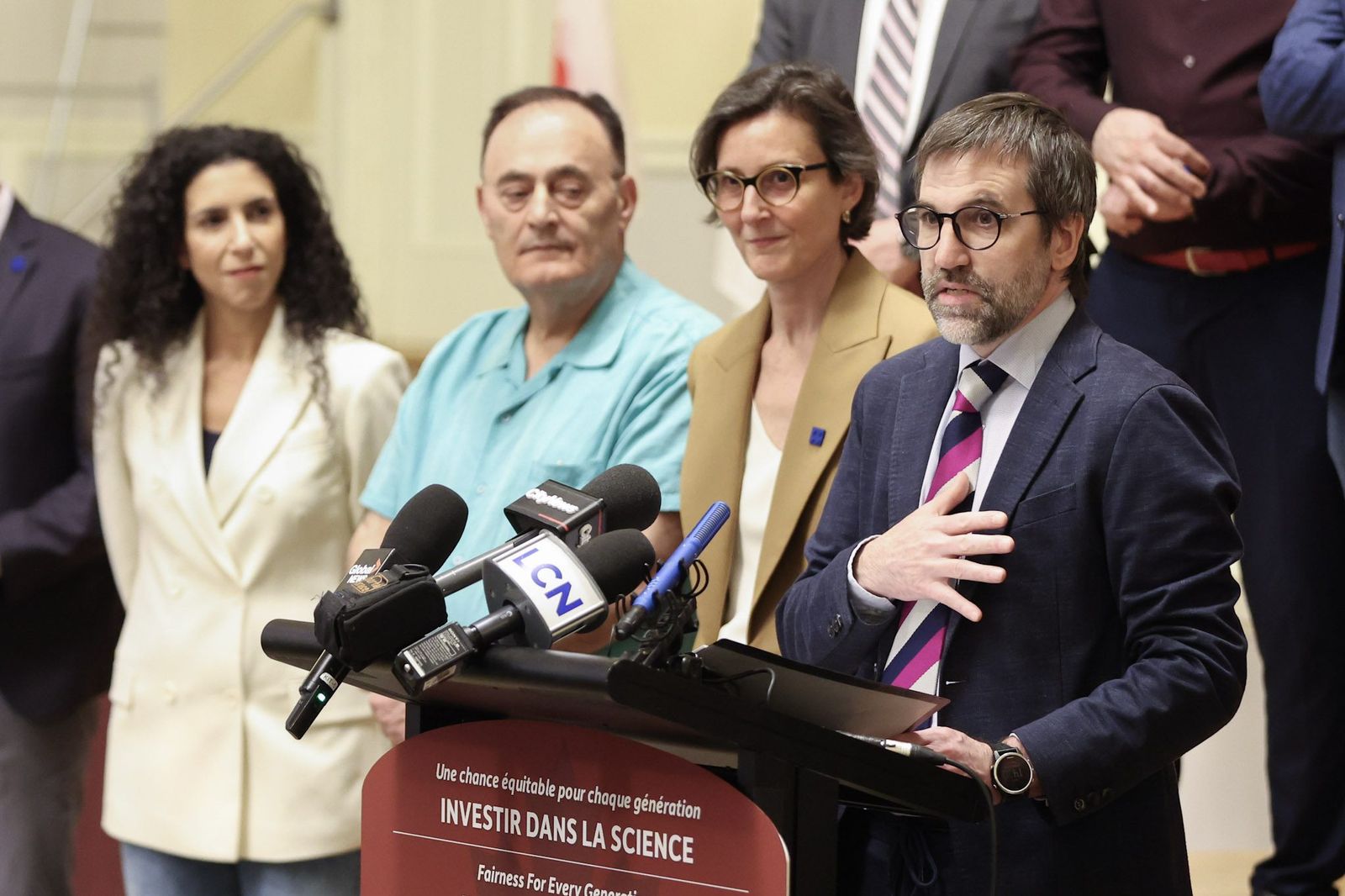 PHOTO: Ministers Marc Miller and Steven Guilbeault join Viviane Poupon, Mario Chartrand, Dr. Gustavo Turecki, MP Anna Gainey and MP Patricia Lattanzio to celebrate an $80 million investment in brain health.
